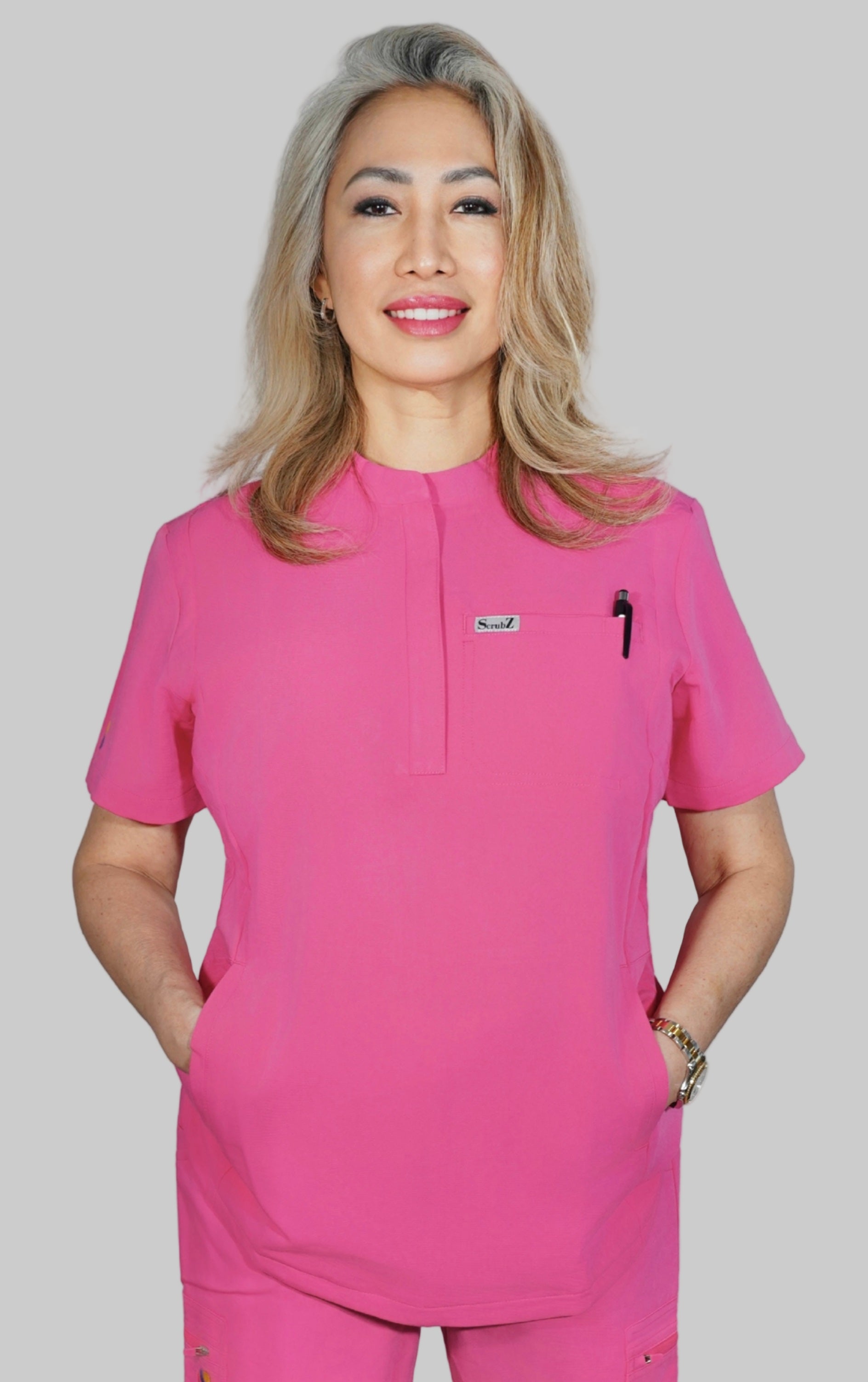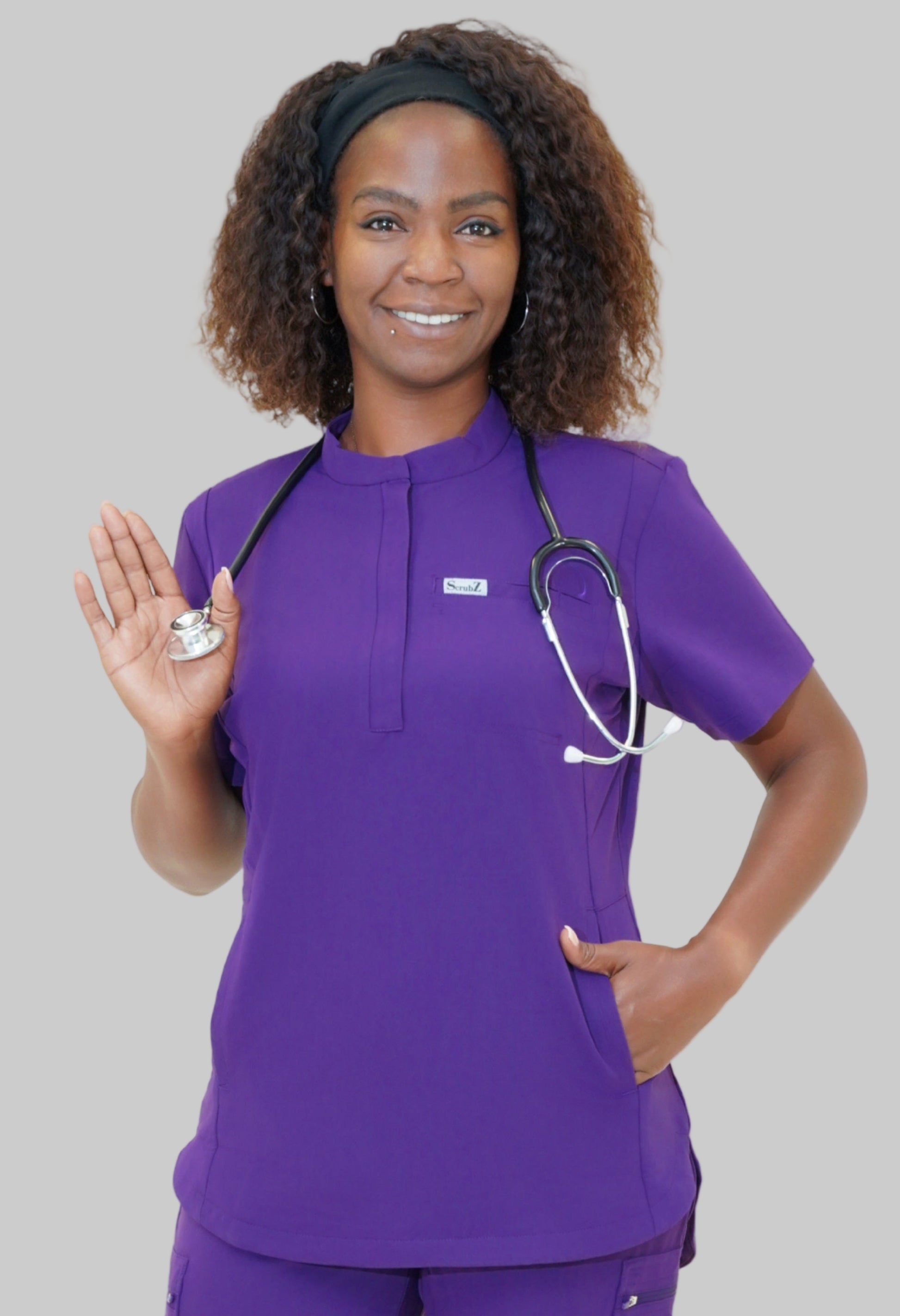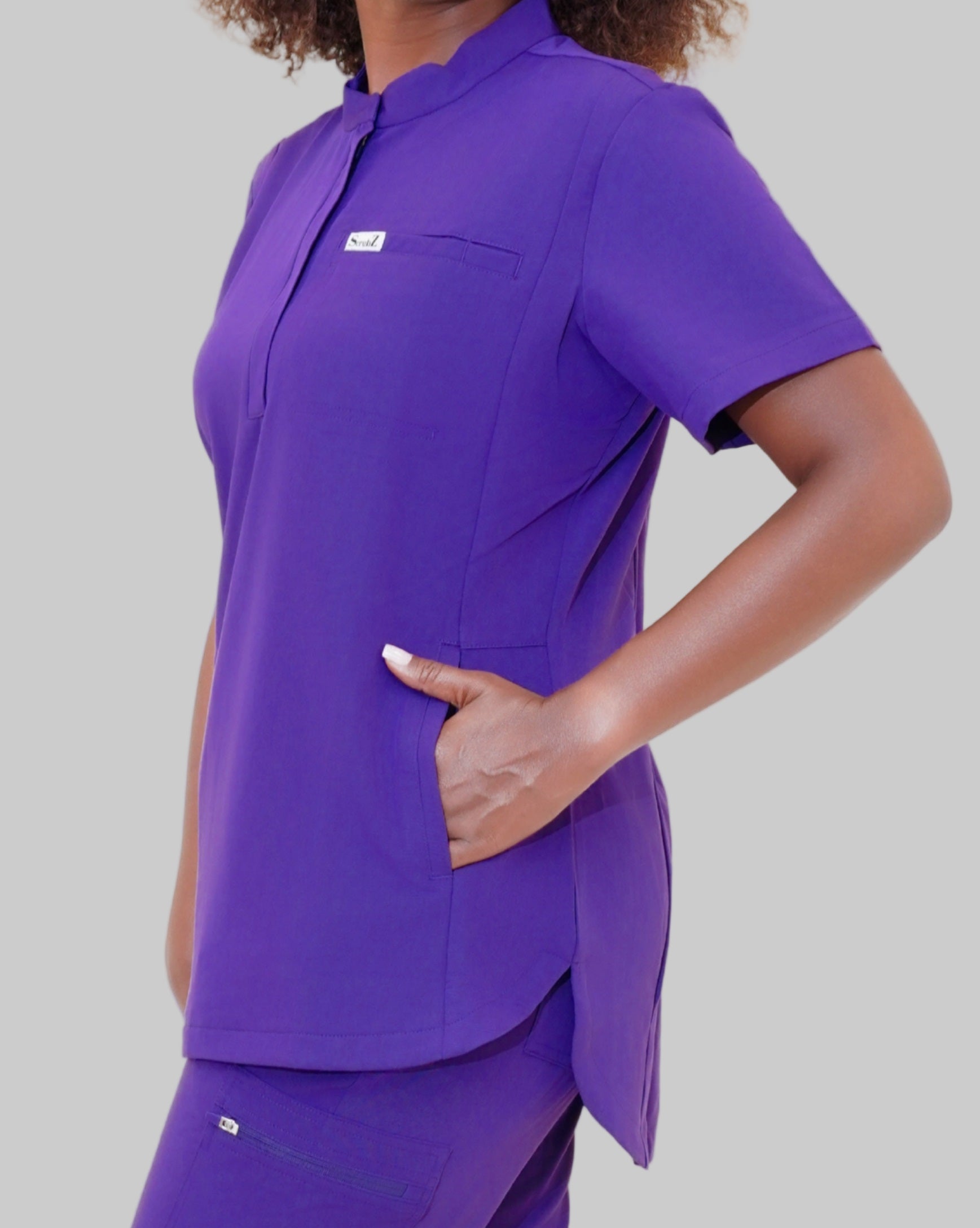 - Mayo Top: Sophisticated mandarin collar design with short sleeves, open chest pocket with pen pocket, dual hidden hand pockets, contoured back seams, and split side seams for enhanced mobility